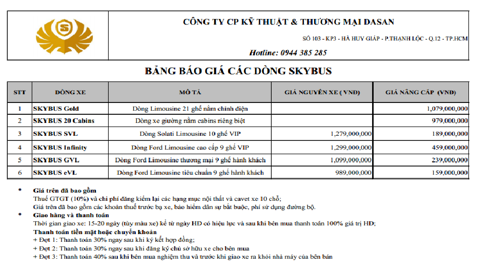 Ngoài giá bán nguyên xe, Dasan còn nhận nâng cấp các dòng SKYBUS hạng thương gia kể trên với mức giá liệt kê ở bảng giá xe limousine dưới đây. Khách hàng có thể liên hệ nhà sản xuất để biết thêm thông tin chi tiết về hạng mục và chính sách giá cho từng dòng xe cụ thể.