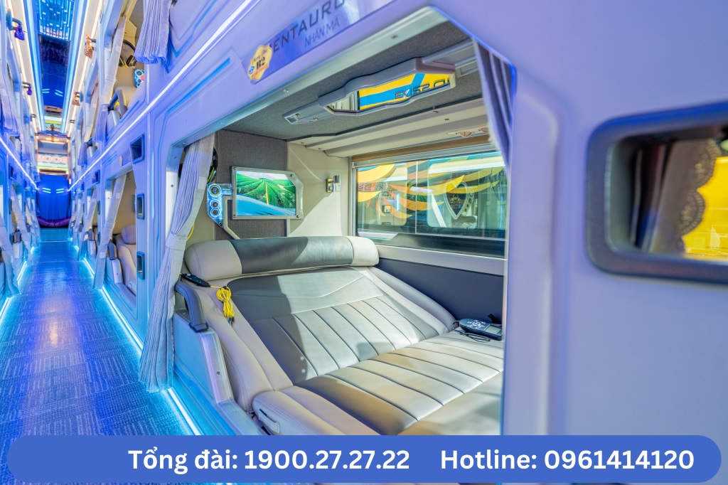 Hành khách có thể lựa chọn giường đôi hoặc giường đơn tùy thích, không gian được riêng tư bởi hệ thống rèm che. Bên cạnh đó, mỗi phòng còn có các tiện ích hỗ trợ nhu cầu giải trí trên đường đi Măng Đen. Có thể kể đến như màn hình LED, tai nghe, đầu sạc USB và cả kết nối internet tốc độ cao.